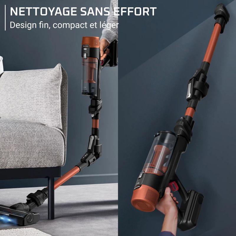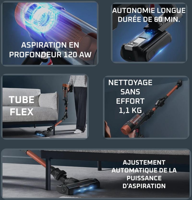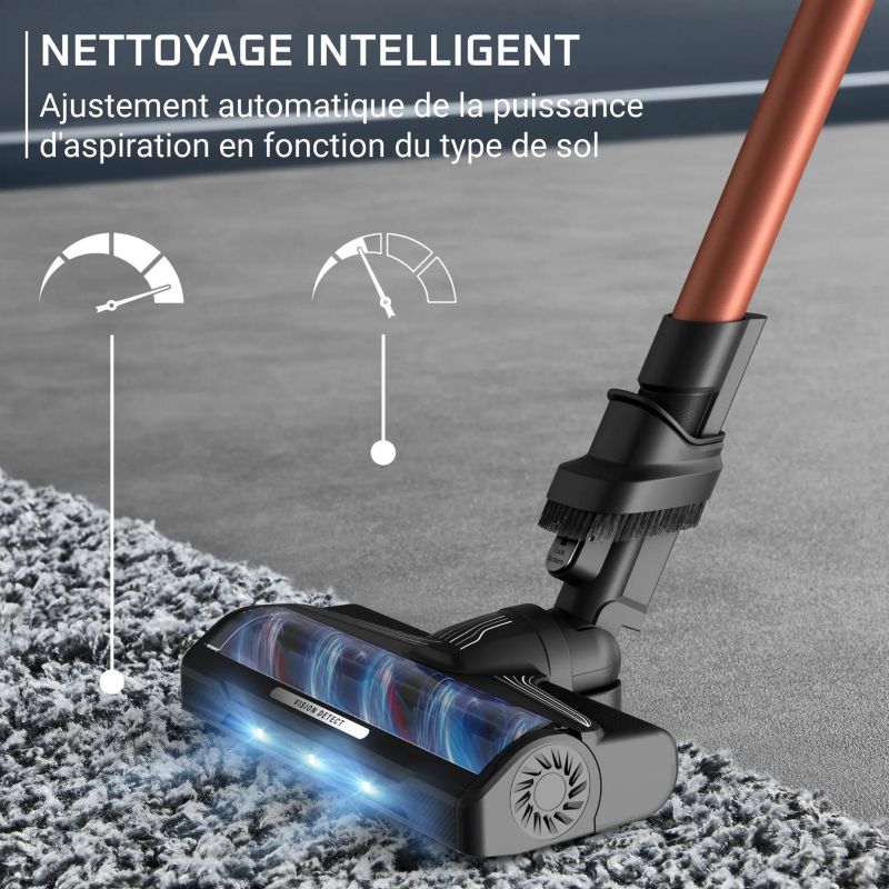 - Brosse motorisée avec éclairage LED : Elle s'adapte à tous les types de sols. Son éclairage LED permet de mieux voir la poussière et plus loin pour un nettoyage plus efficace