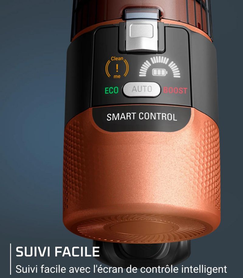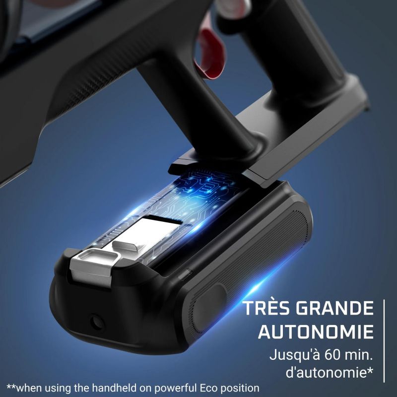 - Détail sur la puissance d'aspiration : Elle peut varier en fonction du type de sols (parquet, carrelage, tapis, moquette) que vous aspirez et du mode utilisé (standard, éco, boost)