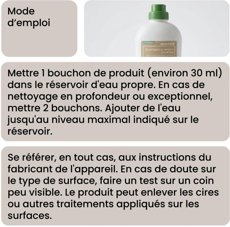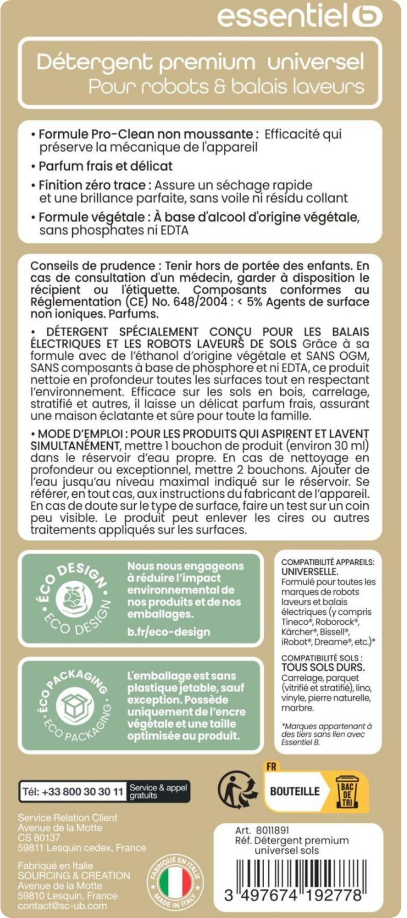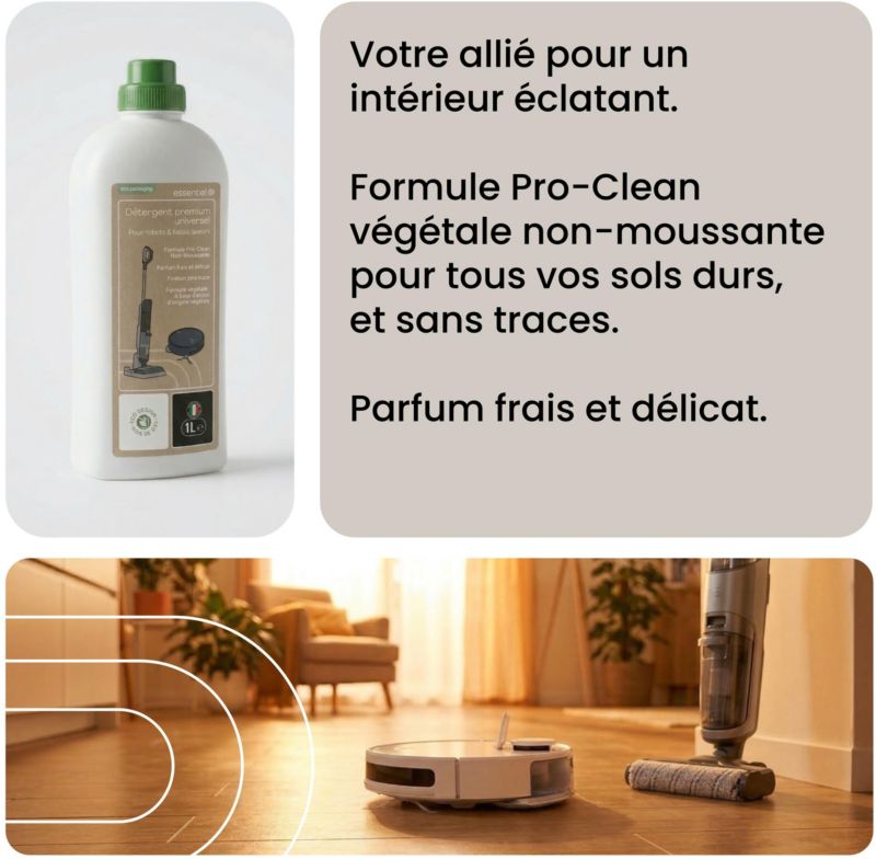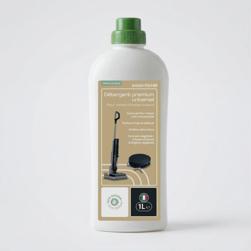 Détergent ESSENTIELB Liquide Nettoyant Sol Universel 1L pour Aspirateur Robot Laveur et Balai Laveur, Anti-Traces (réf : 8011891)