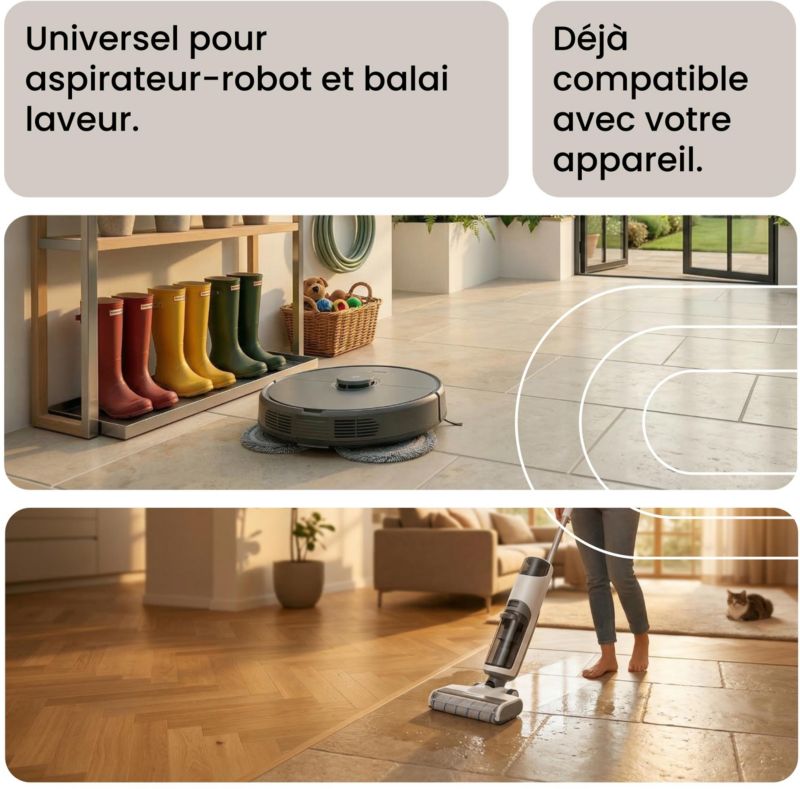 - Modèle(s) compatible(s) : Compatibilité universelle, tous types de robots et balais laveurs de sols.