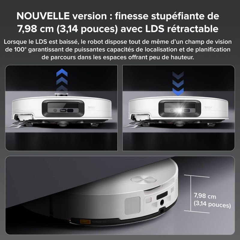 - Capteur LiDAR rétractable : le capteur LiDAR se rétracte dans le châssis du robot pour permettre à l'aspirateur de passer plus facilement sous le mobilier bas