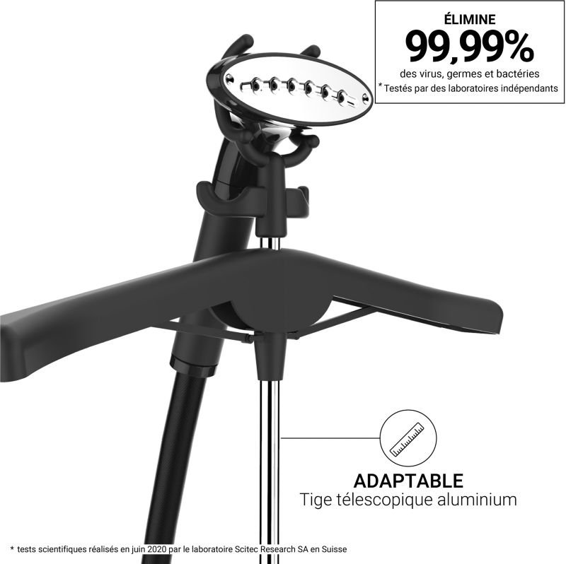 Le + : tige réglable en hauteur et cintre multifonction, ce défroisseur s'adapte à tous vos tissus