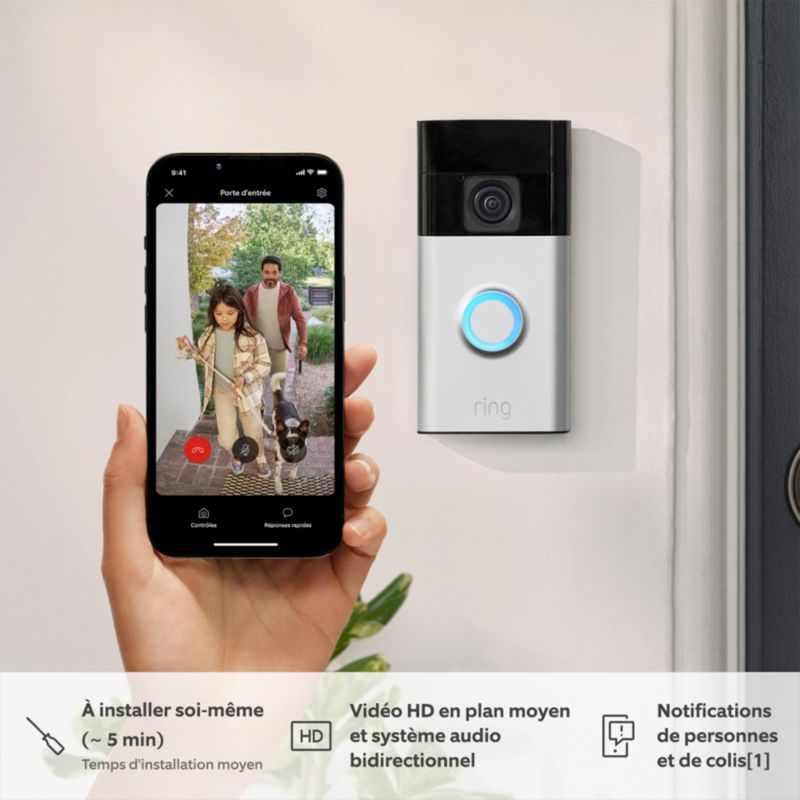 Sonnette vidéo RING Doorbell Nickel satiné sur batterie (réf : 1219118)