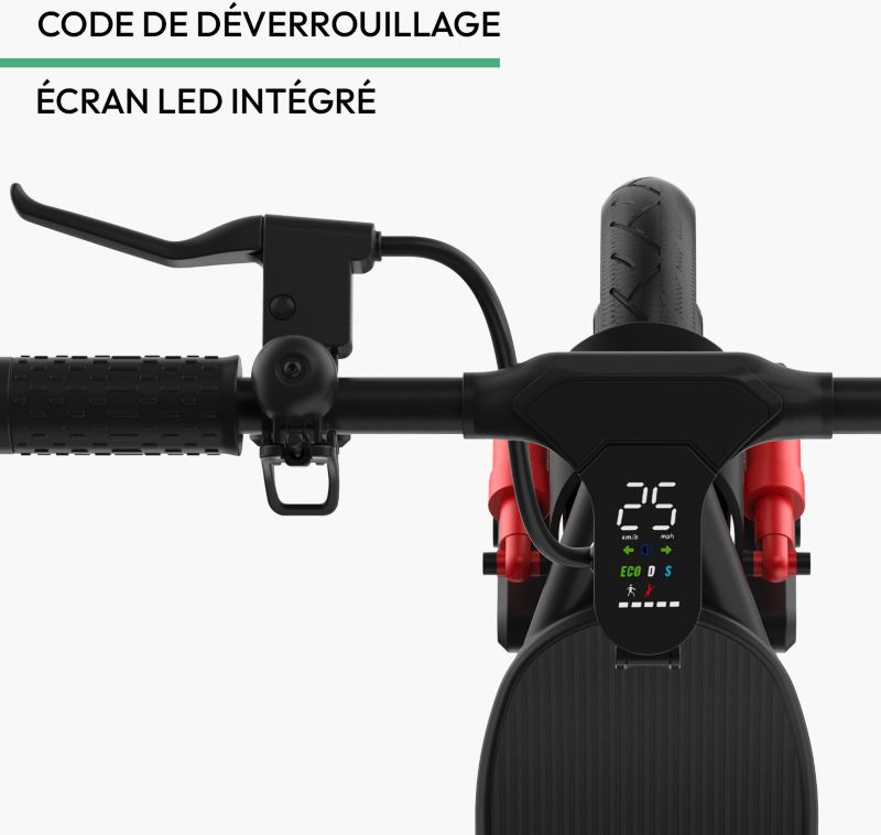 - Ecran d'affichage : Oui, permet de visionner des informations relatives à la conduite (autonomie batterie, distance parcourue, mode de vitesse, etc.)