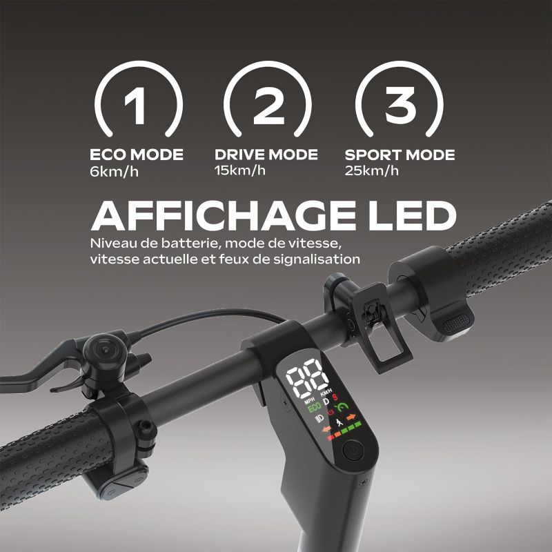 - Ecran d'affichage : Oui, permet de visionner des informations relatives à la conduite (autonomie batterie, distance parcourue, mode de vitesse, etc.)