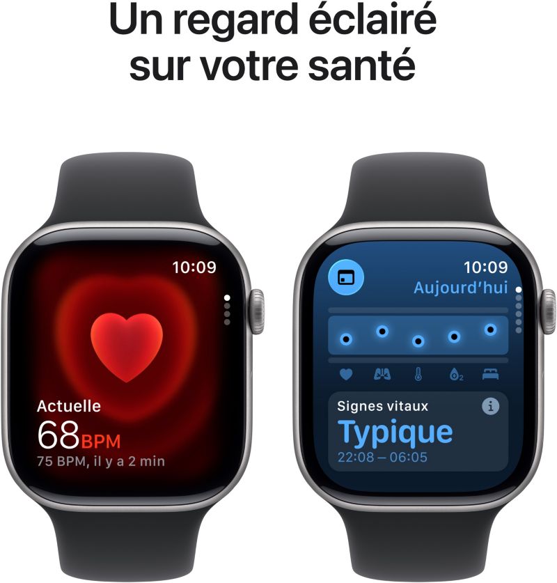 - Bien-être et santé : Suivi et analyse du sommeil, Distance parcourue, ECG, Fréquence respiratoire, Santé féminine
