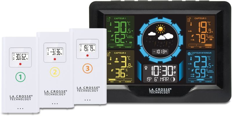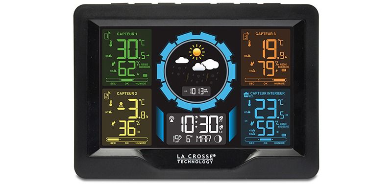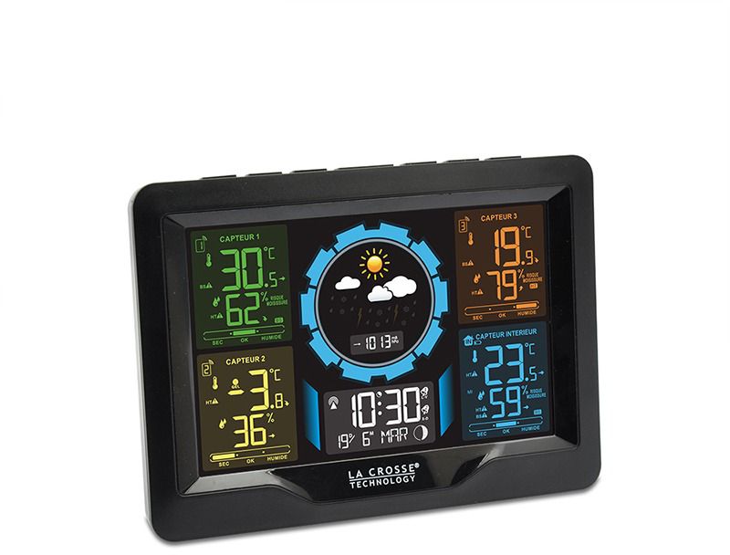 - Détail des indications : Prévisions météo: Oui, Pression atmosphérique, Température intérieure, Température extérieure, Indicateur de température Mini et Maxi, Hygrométrie: Intérieure et extérieure