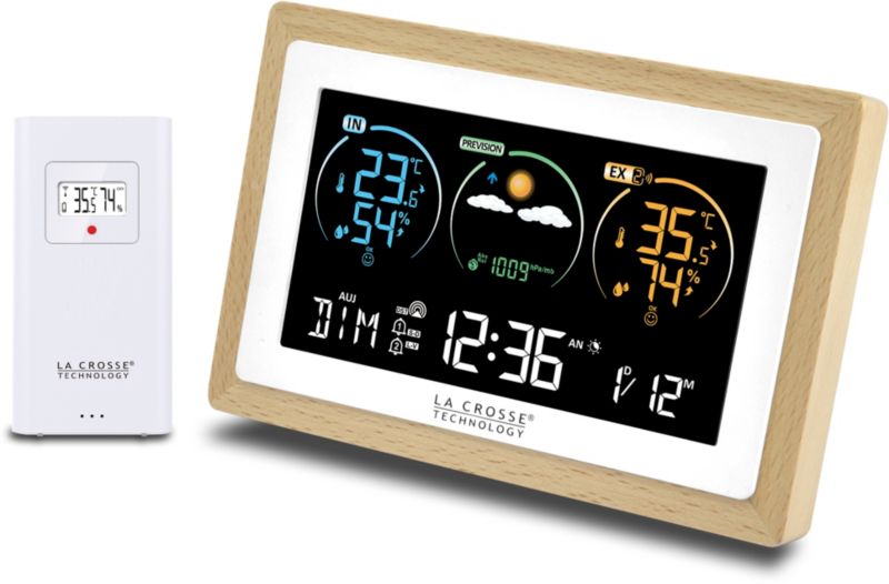- Détail des indications : Prévisions météo: Oui, Prévision gel, Pression atmosphérique, Température intérieure, Température extérieure, Indicateur de température Mini et Maxi, Hygrométrie: Intérieure et extérieure, Indicateur de confort