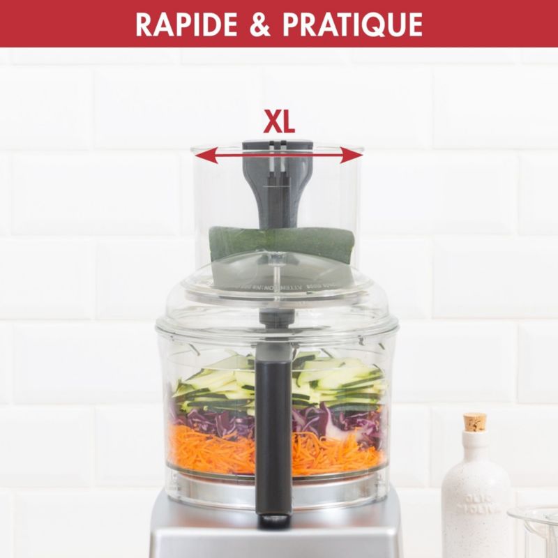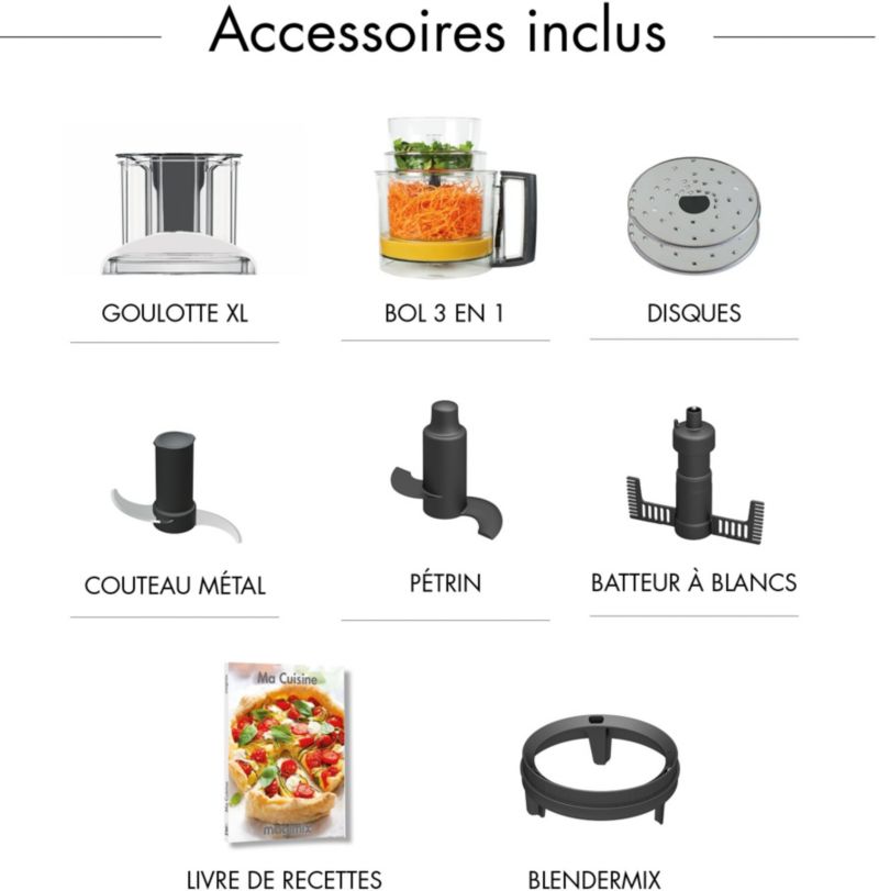 - Accessoires : 3 cuves (cuve standard, mini-cuve, midi cuve), batteur, boîte de rangement des accessoires, disque(s) éminceur, disque(s) râpeur, mini couteau, spatule
