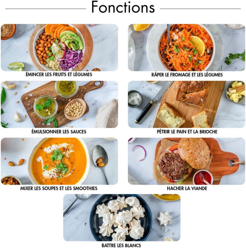 - Battre/Fouetter, Pétrir, Emulsionner, Emincer, Couper/Hacher finement, Hacher la viande, Râper, Mixer