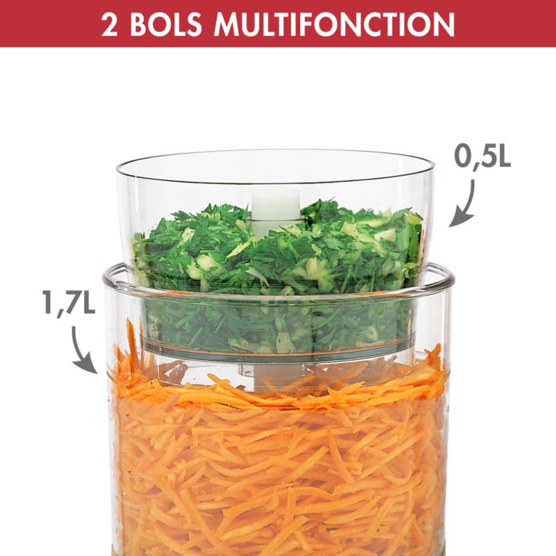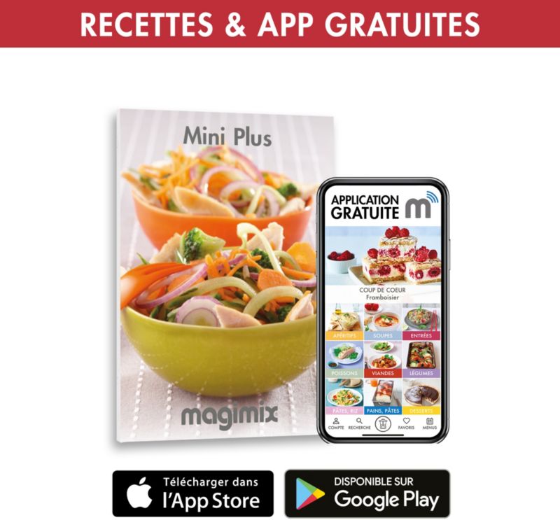 - Livré avec : Notice, Livre de recettes, boîte de rangement des accessoires, couteau hachoir, disque(s) râpeur, spatule