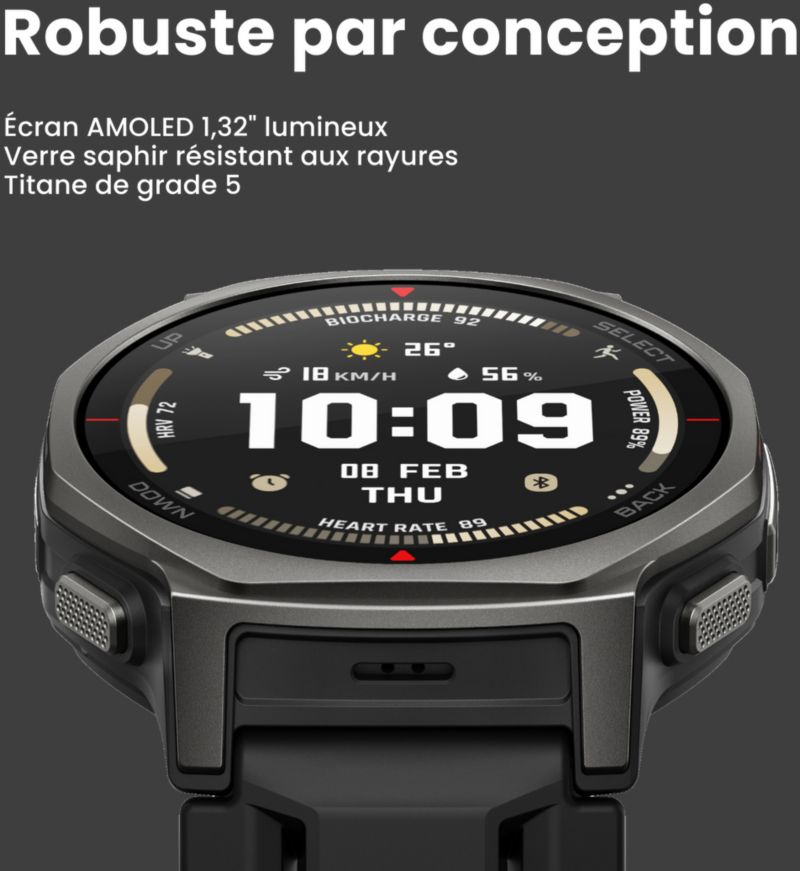 - Capteurs compatibles : Accéléromètre, Baromètre, Capteur de température infrarouge, GPS, GLONASS, GALILEO, Oxymètre, Altimètre, ECG, Thermomètre, Boussole, Gyroscope, Luminosité ambiante