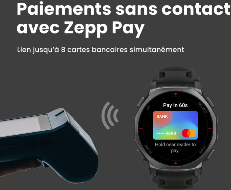 - Fonctionnalités : Appel et notification, Calendrier, Paiement sans contact, Musique, Trouver son téléphone, Mode silence, Lampe torche, Météo, Haut parleur, Lecteur multimédia, Economie d'energie