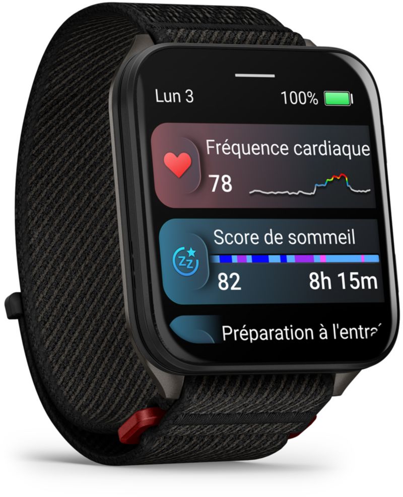 - Bien-être et santé : Suivi et analyse du sommeil, Suivi d'activité sportif, Distance parcourue, Calcul des calories brulées, ECG, Fréquence respiratoire, Age fitness, Body batterie, Niveau de stress, Exercice de respiration, Santé féminine, Hydratation