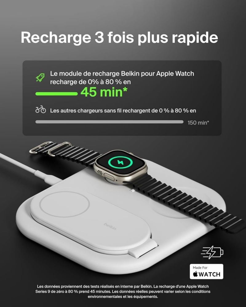 - Avantage : ? Recharge sans fil Qi2 jusqu'à 2 fois plus rapide? ? Recharge rapide de votre Apple Watch Series 9 de zéro à 80 % en 45 minutes? ? Recharge rapide pour l'Apple Watch Series 7 / 8 / 9 et pour l'Apple Watch Ultra 1 ou 2