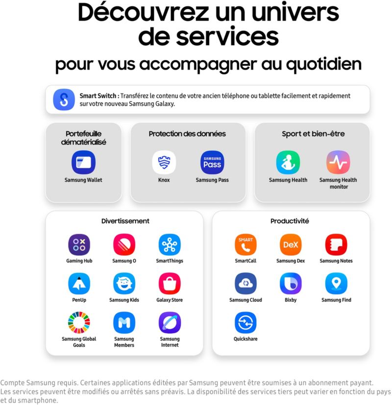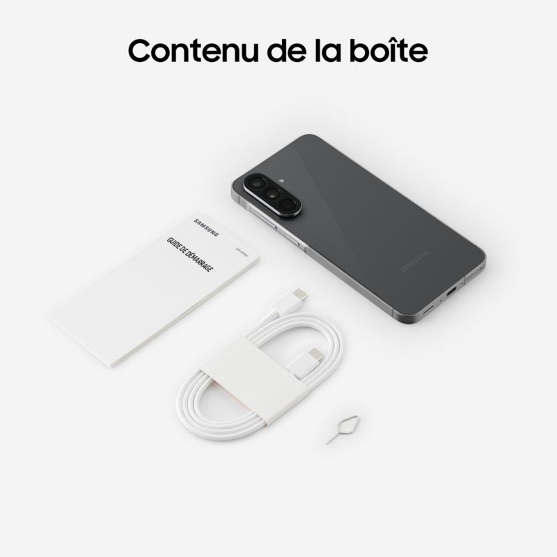 - Autre(s) accessoire(s) fourni(s) : Galaxy A56 5G Câble USB-C vers USB-C Outil d'éjection de la carte SIM Guide de démarrage rapide Galaxy Fit 3
