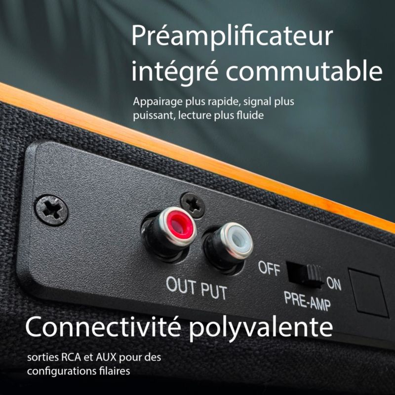 - Pré-ampli phono intégré : oui, permet de raccorder votre platine directement à un ampli ou une enceinte