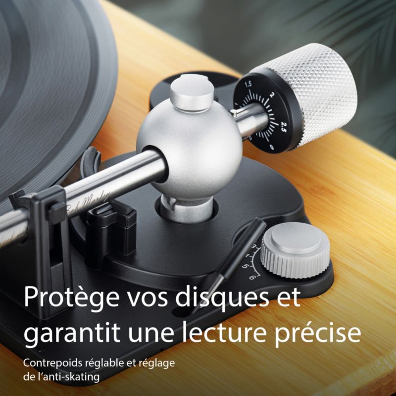 - Antiskating : oui, permet d'optimiser le bon contact de la tête de lecture sur le vinyle pour éviter les coupures de son