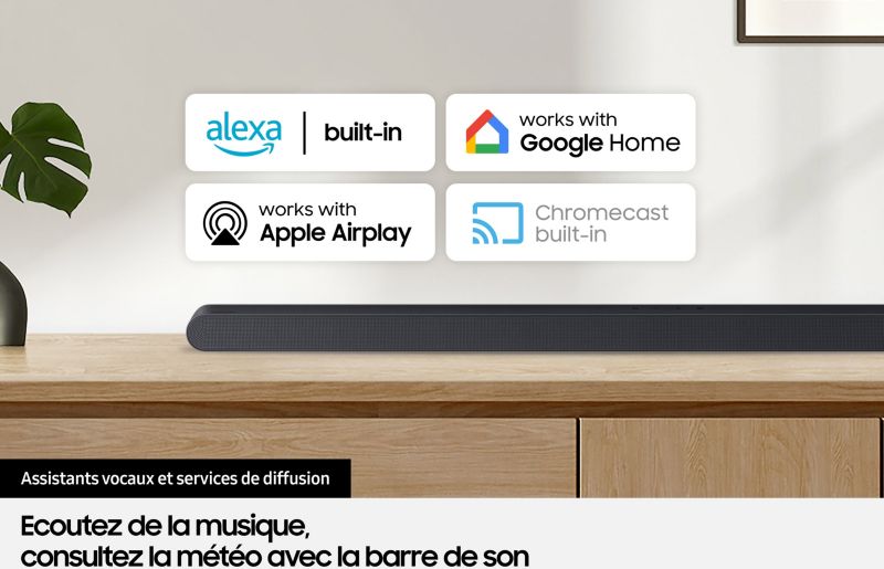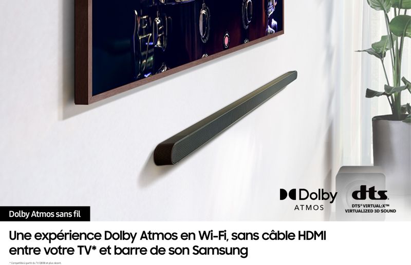 - Traitement du son : Dolby Atmos, Dolby Digital Plus, DTS X, Synchronisation du son TV et barre de son