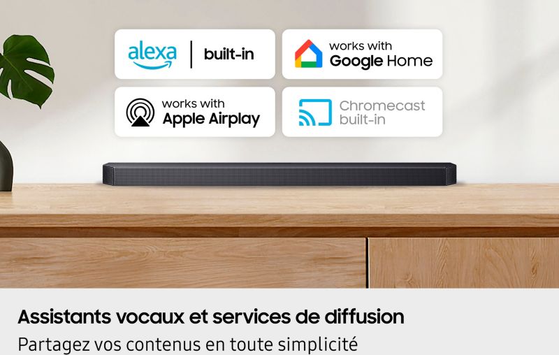 - Traitement du son : Dolby Atmos, Dolby 5.1, Dolby Digital Plus, DTS X, Synchronisation du son TV et barre de son