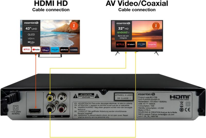 - Détail : : Composite(s): 1, HDMI: 1, Analogique: 1, Coaxiale: 1, Port USB: 1