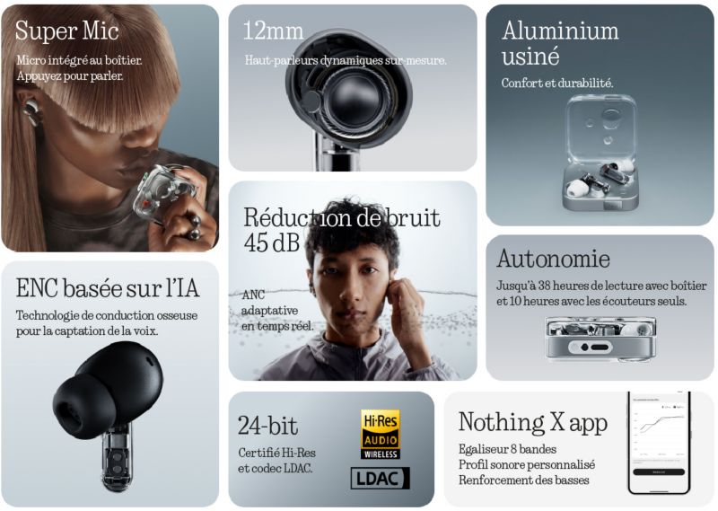 - Autonomie en mode Réduction de bruit active (ANC) : jusqu'à 22h