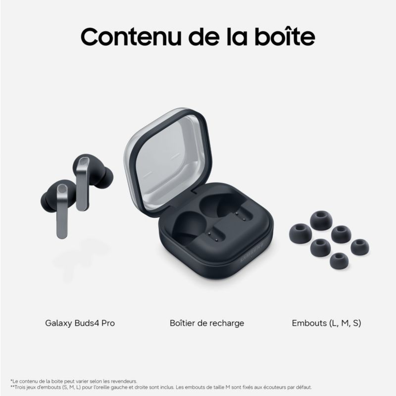 - Livré avec : Embouts: 3 tailles d'embouts S/M/L, Notice, Boitier Buds4 Pro