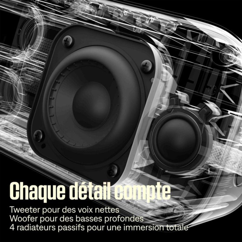 Le + : Son époustouflant, basses ultra profondes dans un format compact, jusqu'à 20 heures d'autonomie