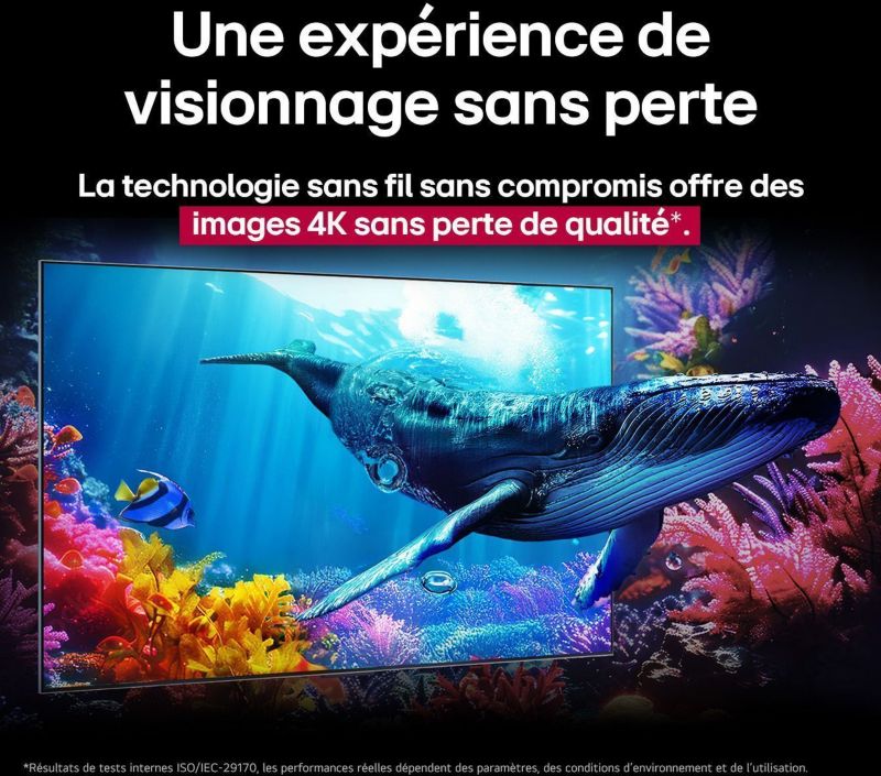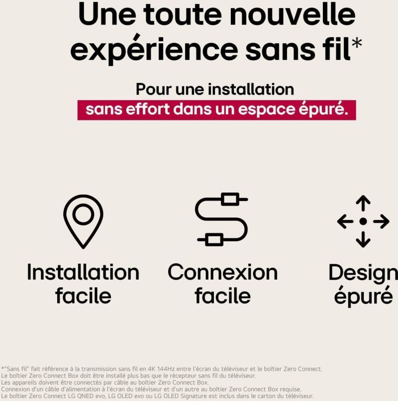 - Connectique déportée : boîtier Zero Connect. Ce boîtier déporté sans fil, regroupe toute la connectique du téléviseur (USB, HDMI...) et envoie un signal jusqu'en 4K 120i/s à l'écran pour que l'image apparaisse