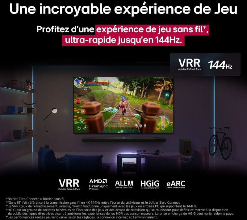 - VRR : oui, permet de synchroniser les fréquences de rafraichissement d'image de la télévision avec la plateforme de jeux vidéo pour une image fluide et sans aucune saccade