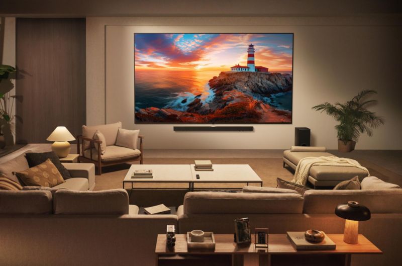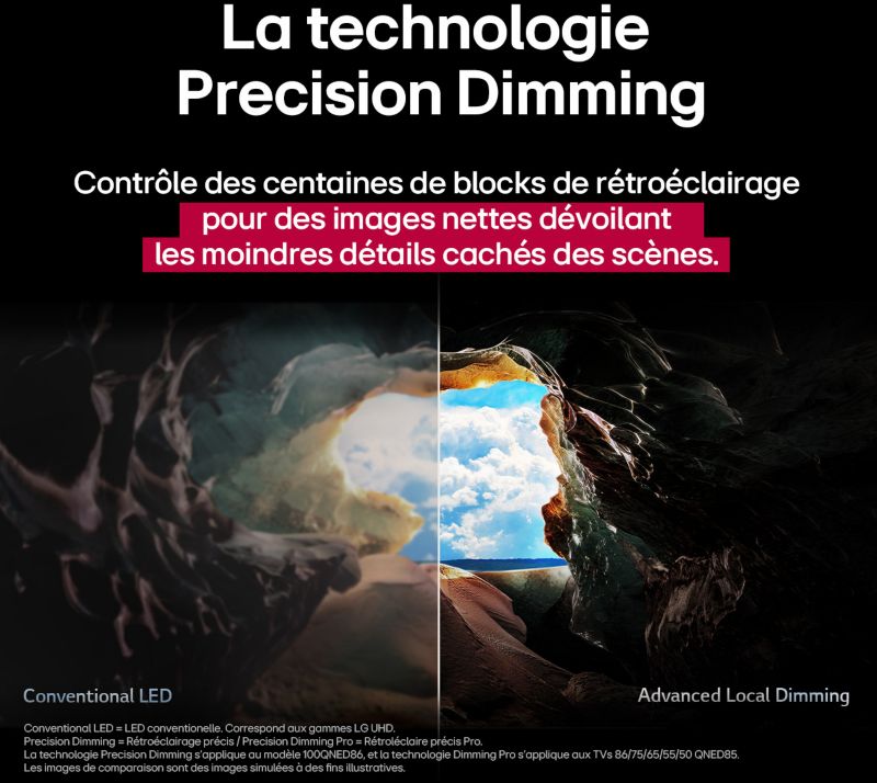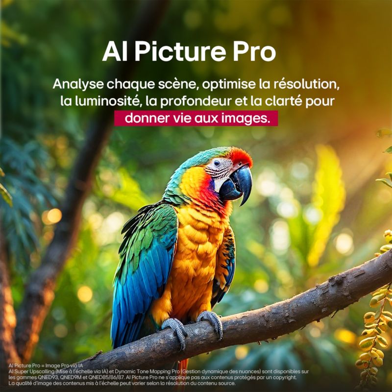 - Technologie : QNED, permet de gagner en profondeur et en détails, en affichant simultanément des noirs profonds et des blancs très lumineux