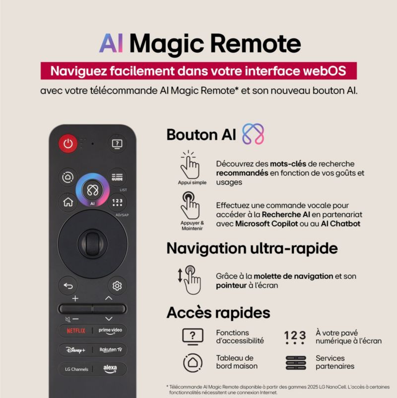 - Livré avec : Télécommande, Télécommande Magic Remote, Pied