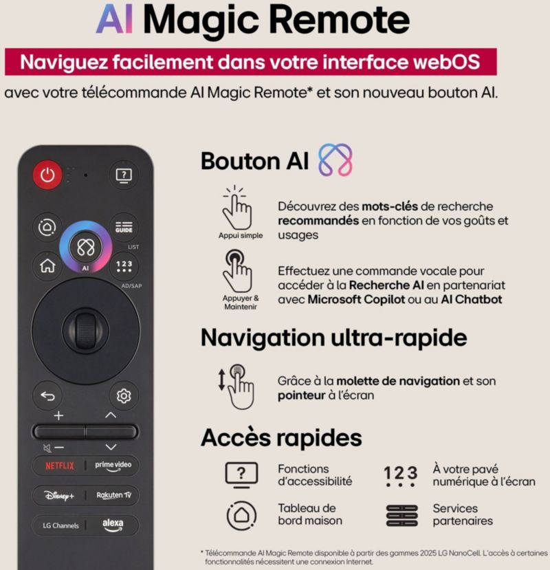 - Livré avec : Télécommande, Télécommande Magic Remote, Piles, Support mural, Accroche murale incluse