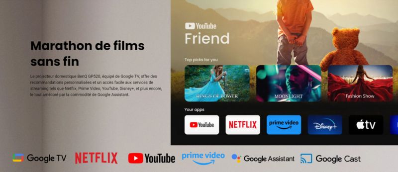 - Technologie : DLP, l'image est créée en projetant successivement et rapidement les couleurs d'une roue chromatique ce qui permet d'obtenir une image nette, des couleurs naturelles et des noirs profonds
